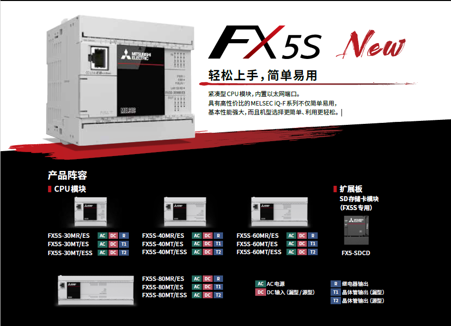 FX5S系列紧凑型CPU模块,内置以太网端口。具有高性价比的MELSEC iO-F系列不仅简单易用基本性能强大,而且机型选择更简单、利用更轻松。