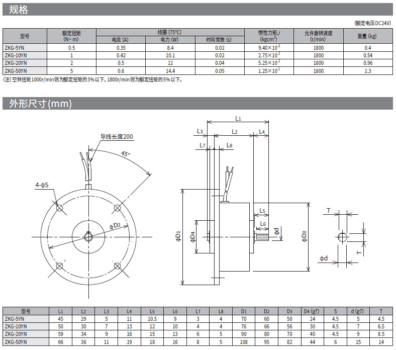 ZKG-YN型微型磁粉制动器额定扭矩:0.5~5(N·m)自然冷却式突出轴型紧凑设计的微型系列。旋转部的惯性力矩设置小。可从5r/min开始使用。